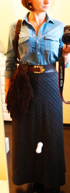 Клевый образ с джинсовой рубашкой и сумкой ковбойской, я бы еще туда пышную кружевной юбочку до коленки померила :)