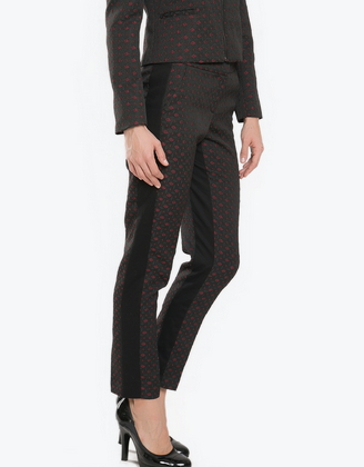 Брюки зацепили принтом, я долго себе искала брюки с принтом. Думаю, многие в моих комплектах видят брюки с принтом. Но именно для себя тяжело найти правильные брюки. Во-первых, мне нужен мелкий рисунок, который имеет вертикальную раскладку, во-вторых, брюки должны быть темные, в Инсити еще и контрастные полосы были.