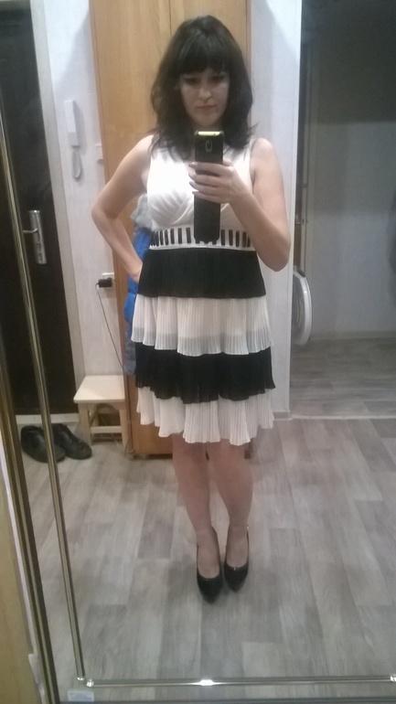 ужас!!! вам по типу фигуры нужен совершенно другой крой. и цвет не черный с белым, а что-то поярче