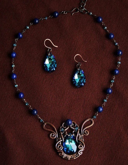 Подарили мне на Новый год вот такой комплектик - ручная работа, кристаллы Сваровски и маленькие лазуритики)). С сережками все понятно, а вот с чем носить колье, не придумаю)) изначально хотела его под определенное платье, но когда померила- не идет оно никак к классике (или именно к тому платью?...) В общем, подскажите, с какой одеждой будет сочетаться?