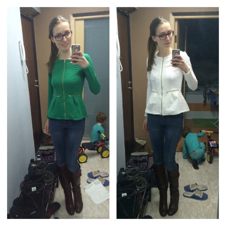 С джинсами никак не катит. Внизу девушка выложила фото модели — мне очень нравится. А вообще я за зеленый проголосовала