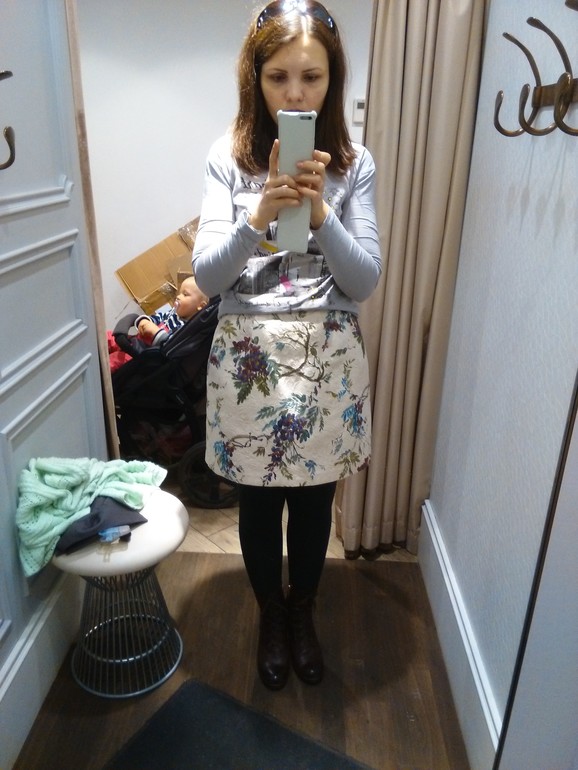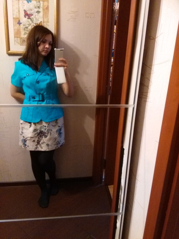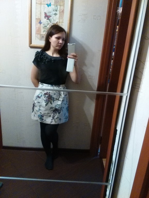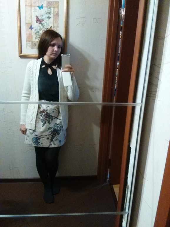 вы уж извините, но мне кажется, что эта юбка делает ваши бедра крупнее и длина какая-то непонятная. может, конечно надо колготы заменить, но ни один из вариантов вас не красит. вообще, по опыту, если уже в примерочной вы не представляете с чем носить вещь, лучше не покупать вообще))
