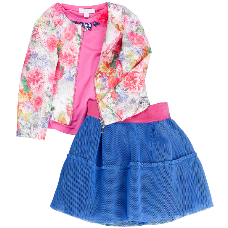 Или очаровательный комплект - юбка, футболка и легкий жакет.