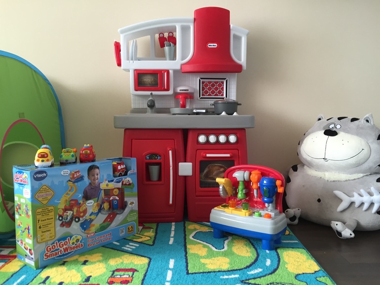игрушки: кухня от1,5 лет. Сначала думала про воркшоп для мальчика... Но мне не понравился пластик, громоздкость и он от 2 лет, а нам 1.2. Поэтому кухня. Она может делатся пониже, для детишек пониже, пока играю я)) маленькая мастерская справа, там 8 звуков, и Леве очень нравится на все нажимать) пусть потренируется перед большой мастерской))) и слева пожарная станция нашей любимой серии vtech smart wheels. А наверху коробки стоят испанская бетономешалка, американская гоночная машина и русская пожарка. В общем мы коллекционируем)