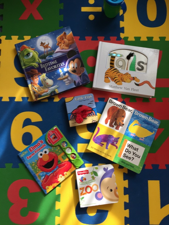 Книжки: рассказы с диснеевскими героями (на постарше, но не смогла пройти мимо моих любимых мультперсонажей))), хвостики (супер книжка, на одной из страниц есть даже скунс с настоящей вонялкой! Вроде в россии тоже есть, очень советую, в ней хвостики из разных материалов!), маленький краб (купили, чтоб в дороге занимать Леву), браун беа пока не пошел, это обыкновенная книга с окошками, музыкальный элмо в подарок, а зу фишер прайс подарили нам. Сейчас мы учим зверюшек - нам очень кстати)