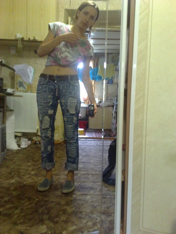Мне подруга отписала джинсы-я похудела, дома ничего не осталось из брюк приличного. На новые денег в данный момент нет-да и не верю я что буду худой долго. Сейчас я 42 размера-но я такой никогда не была. И как закончу ГВ-снова стану пышкой.
