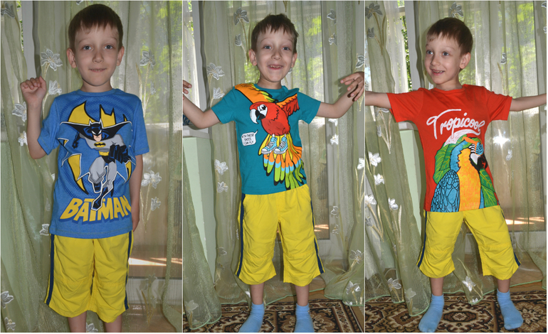Размеры разные, одна ф-ка самая маленькая, там размер 104, хотя мы давно уже 110, 116 носим, но и 104 на это лето может поносим. остальные ф-ки размер 122, а шорты - 128, в талии достаточно широкие, надо туго затягивать шнурок.У Эрика на это лето столько футболок, что я ума не приложу, когда мы успеем их все поносить