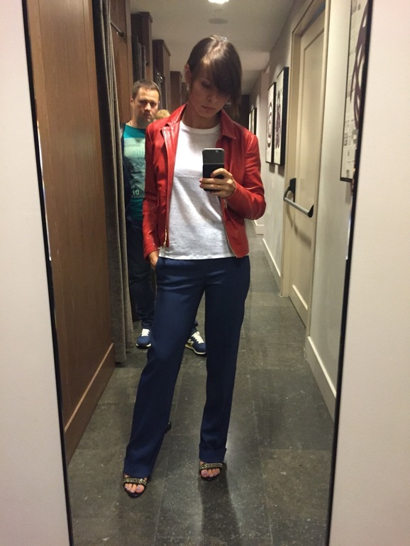 в таком варианте красоту босоножек не видно( красная куртка — это классика, тем более хорошего качества, это всегда вещь-инвестиция, вне моды!