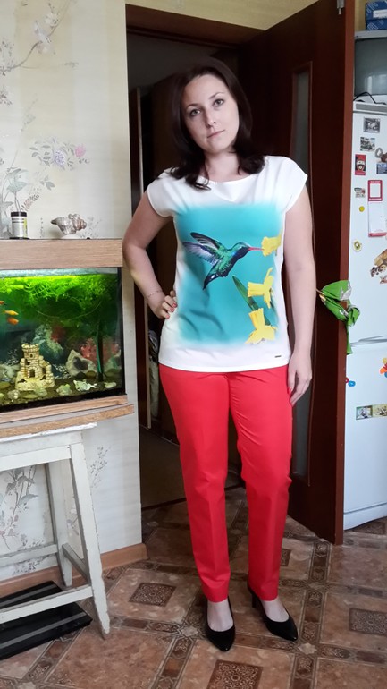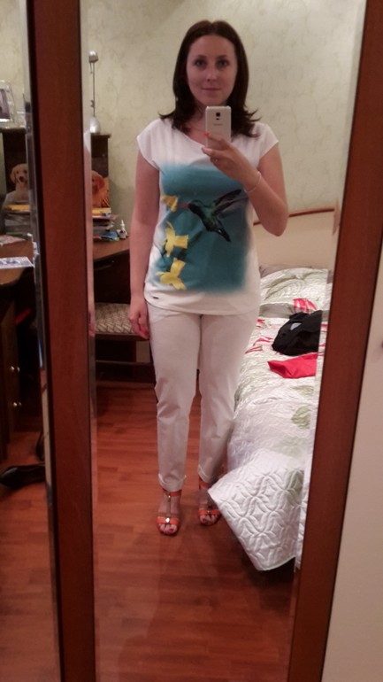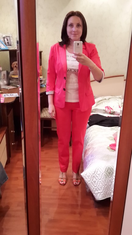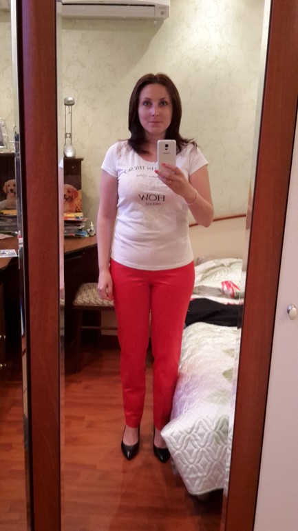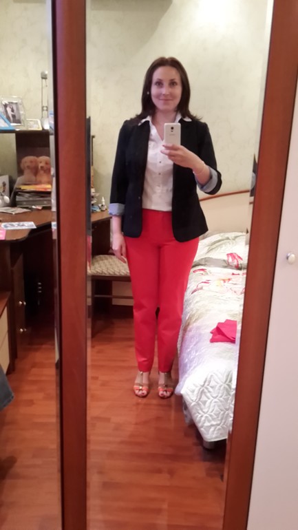 ого,а вы постарались))) нащелкались от души)) Красные брюки вам отлично. Только макияж поярче, блузку лучше однотонную, белая хорошо, можно талию ремешком обозначить,черным или красным. Юбки вам лучше пышные. Белые брюки отлично с майкой с птичкой. Кстати красные брюки с рубашкой с рукавом шикарно. НОСИТЕ ЭТИ БРЮКИ! Они классные.Розовый педжак правда уже с ними перебор