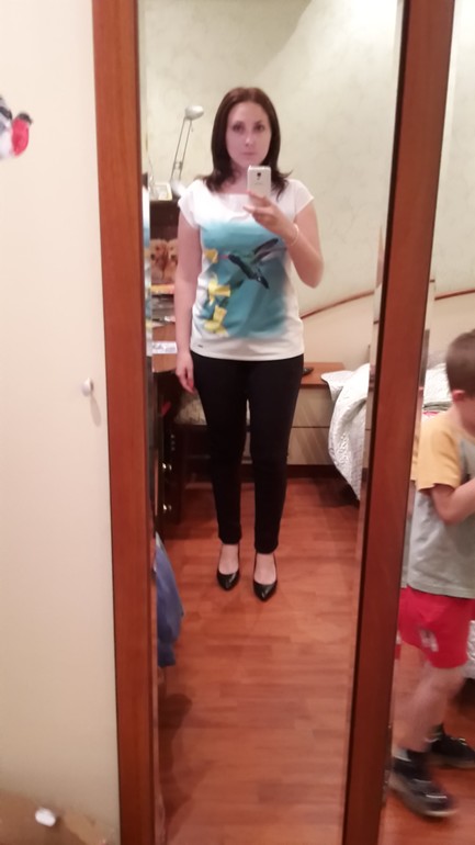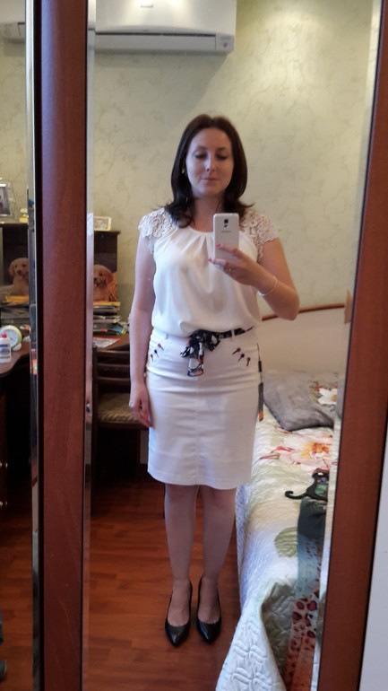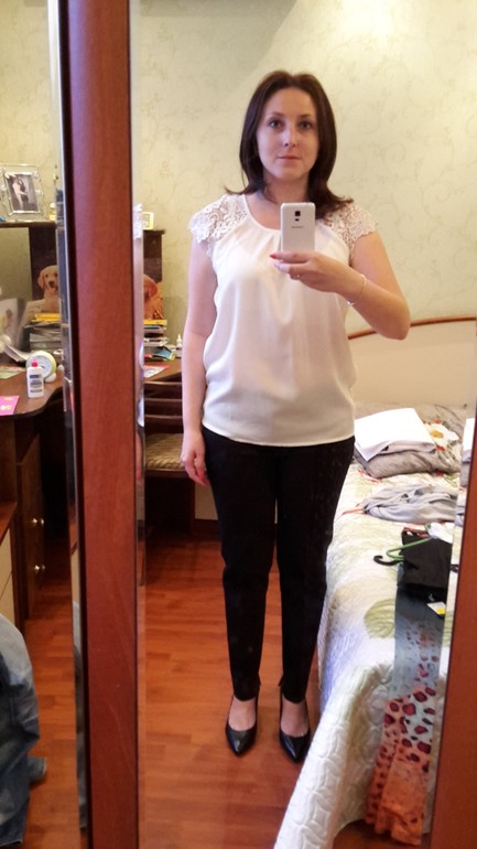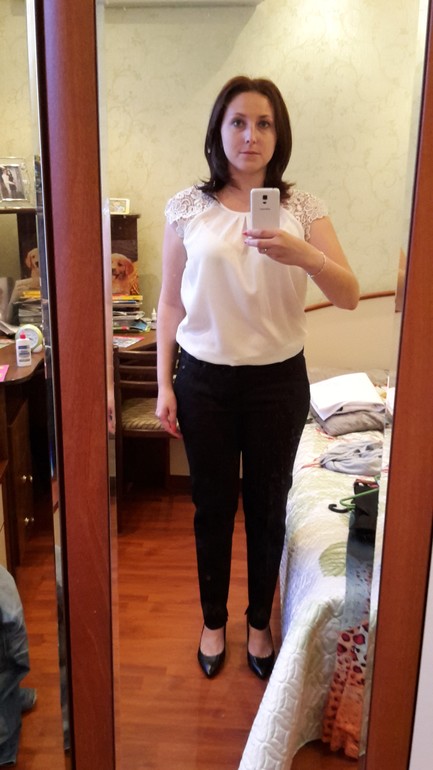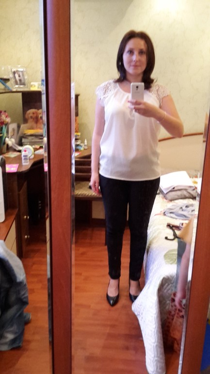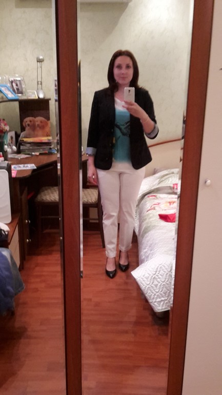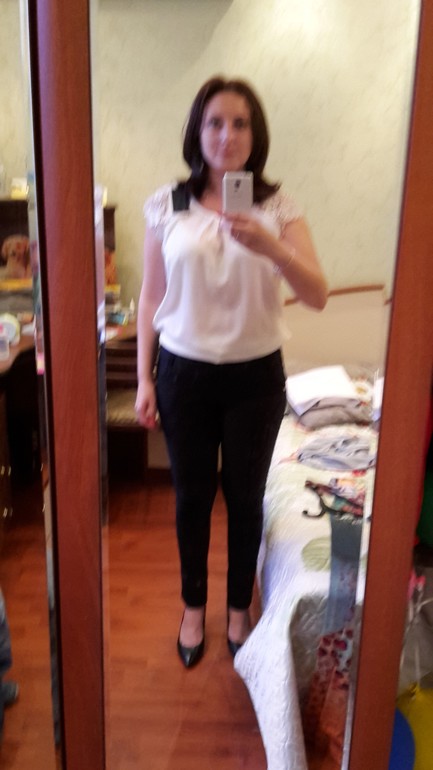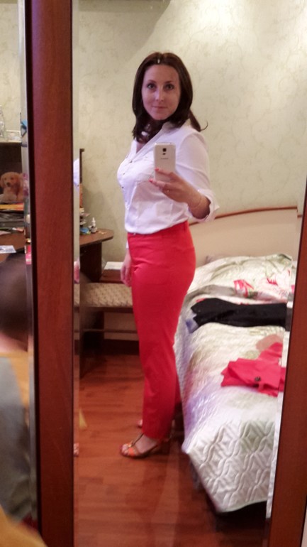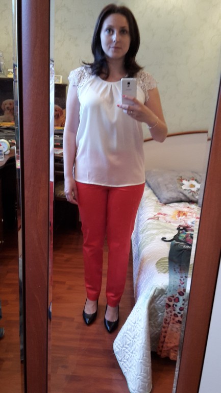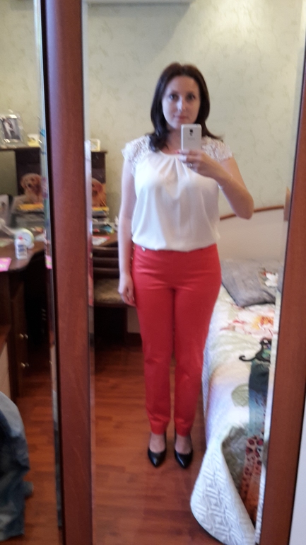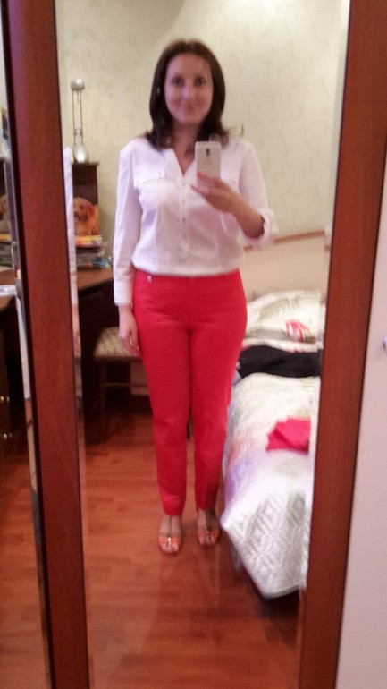 Зауженные брюки вам совсем не идут.. Вот красные - очень классно! Сразу уравновешивают вашу фигуру. Белая блузка мне нравится и навыпуск, и заправленная. Юбка прямая не очень.. В расклешенной намного красивее.