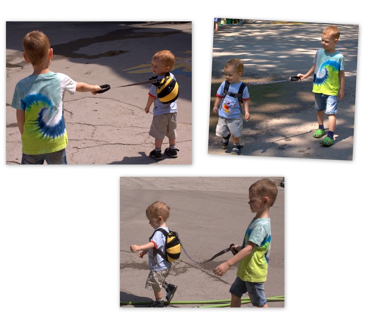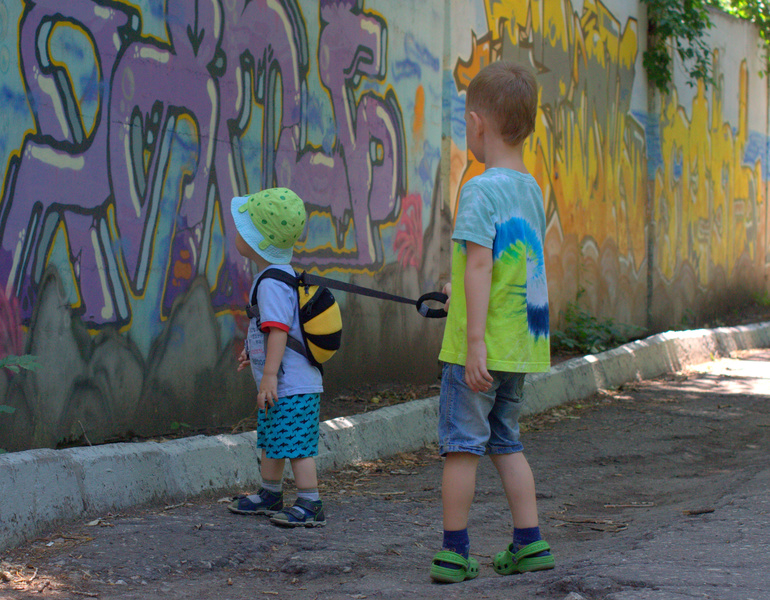 Поводок как поводок, лаконичный и простой, у собак обычно более навороченные варианты (регулировка длины, автоматическое сматывание, электрошокер…). Пристегивается к специальному колечку на рюкзачке. Длина немаленькая, мой ребенок ограничения свободы почти не ощутил, зато Дима в полной мере почувствовал вкус власти, притормаживая Сашу перед лужами, чужими собаками, да и просто так, развлечения ради. Справедливости ради отмечу, что Санек никакого чувства унижения собственного достоинства не испытал, а радостно поддержал игру и присоединился к всеобщему веселью. А мне внезапно понравилась эта функция! Потому что дети в кои-то веки не разбегались в разные стороны, как тараканы после включения света на кухне, а держались на расстоянии полутора метров друг от друга, не покидая поле моего зрения.