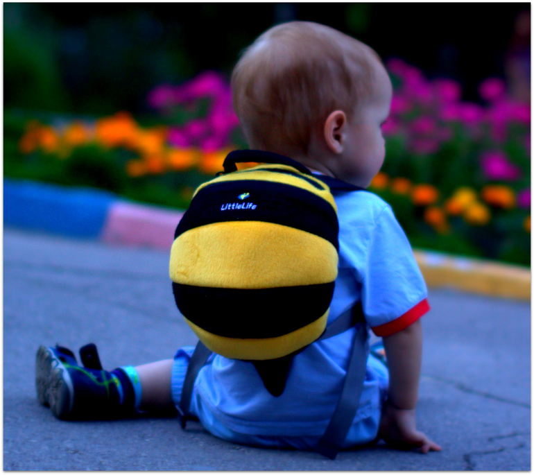 И в качестве бонуса - Димка с рюкзачком-пчелой. Пока я снимала, Саша гневно вопил, давая понять на своем языке, что эту вещь он никому давать не намеревался. Даже на время. Потому что она - любимая.