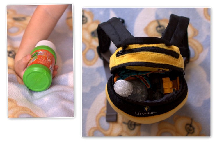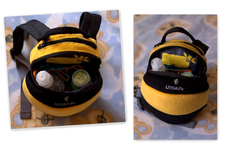 Подведу итог по внутреннему объему рюкзачка: он на самом деле очень маленький. Не могу назвать это минусом, потому что негоже нагружать таких малышей тяжестями. И без того небольшое полезное пространство рюкзачка отчасти съедается внутренним кармашком, где прячется капюшон. Убрать кармашек с капюшоном никак нельзя, он неотъемлемый, а потому придется делать выбор в пользу ну сааамого необходимого. Оно и к лучшему: незачем таскать с собой всякие излишества! Вы сможете упаковать памперс, смену белья, влажные салфетки, легкий перекус, мелкие игрушки. Не стоит рассчитывать, что ребенок потащит полноценный багаж, включающий теплую одежду, еду на три дня, подарок тетушке и эмалированный горшок. Это все тащите сами;) Как вариант: можно освободить маме руки для активной прогулки на площадке, положив в рюкзачок свои ценности - телефон, кошелек и ключи. Сможете лазить по горкам и качелям, не стесняя себя в движениях сумкой. Только смотрите, чтобы детка не дала кому-то поиграть яркой «пчелкой» с такой важной начинкой.