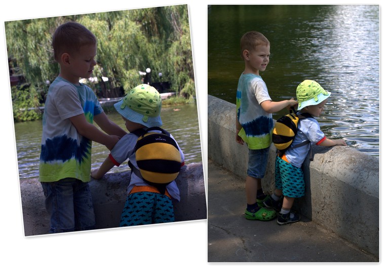 Когда поводком мы уже наигрались, Санька радостно кинулся к воде в надежде поплавать. Но плавать в этом небольшом водоеме запрещено, причем не только мною лично, но и администрацией парка, о чем заявлено на специальных табличках. Но Сашенька читать не умеет, потому посчитал это живописное место вполне подходящим для ныряния. Но мой сознательный старший сын (который к тому же умеет читать) преградил младшему дорогу чтобы тот не искупался без него. И если сначала Димка пытался просто загородить Саше путь к воде, то потом он попросту ухватил специальную ручку-петельку на рюкзачке. Удобно! Я и сама не раз ловила за эту ручку не разбирающего дороги малыша, спасая его от падения или просто наставляя на путь истинный.
