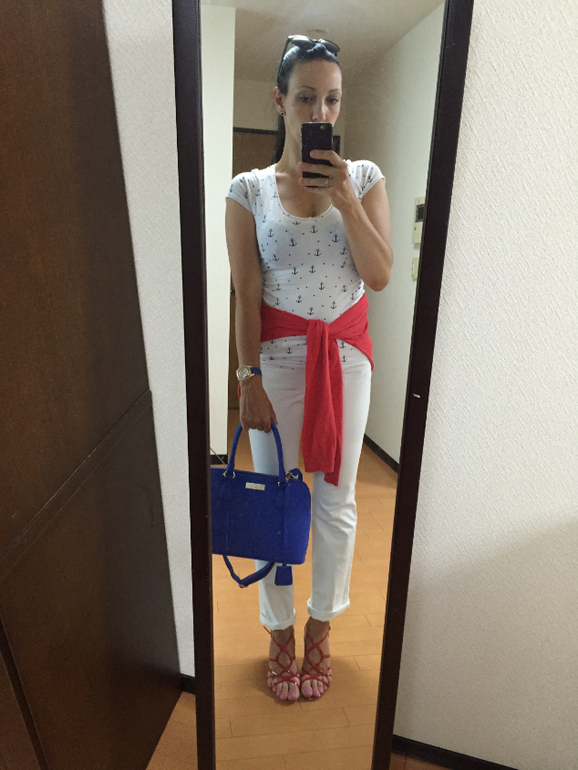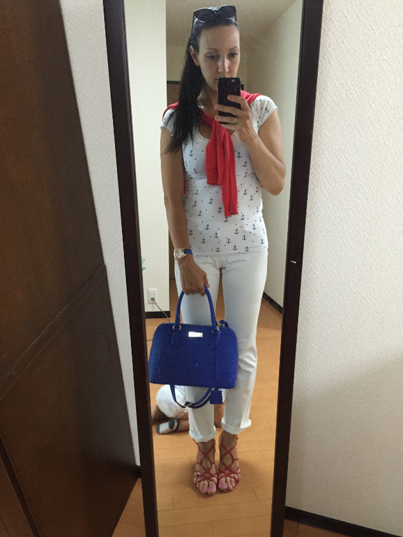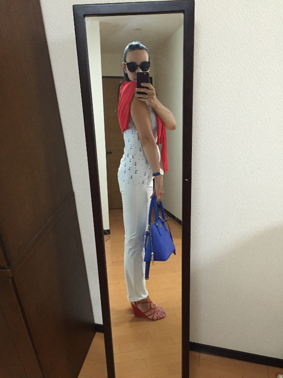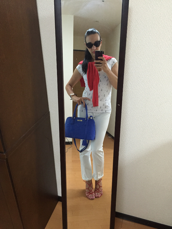 уже, наверное говорила, что кардеган в Японии является аксессуаром, носят его на плечах, завязывают на талии и даже вокруг шеи, как шарф. На улице ужасно жарко, на зайди в помещение - магазин, офисс или еще куда-то, кондиционеры работают по полной, поэтому кардеган тут пригодится по своему назначению.