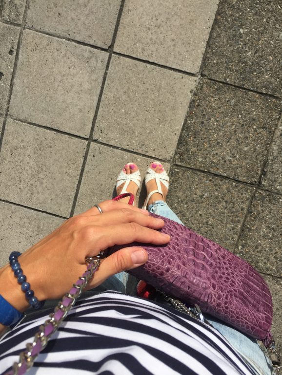 Лена, здесь я с критикой, уж извините. Платок вообще не из этой оперы. Футболка "разбитная"(в хорошем смысле), с кедами, мокасинами — пожалуйста, но не с этими изящными босоножками, простая белая блузка или футболка смотрелись бы в 100раз лучше, и синие браслеты со сливовой сумкой конкретно в этом образе ни туда и ни сюда( понятно что вы хотели подчеркнуть ими полоску, но с сумкой они "спорят" конкретно)