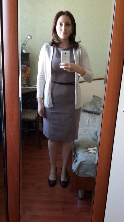 Извините, но мне не нравится ни кардиган, ни платье, ни туфли. Вы молодая и симпатичная, а похожи на школьного завуча.
