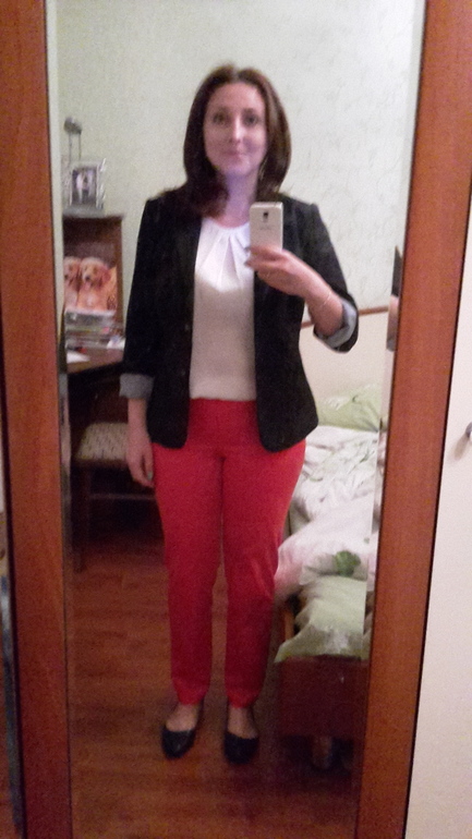 подходит ли этот пиджак сюда. Хочу одеть красные штаны, но прохладно на улице. А пиджак только один (
