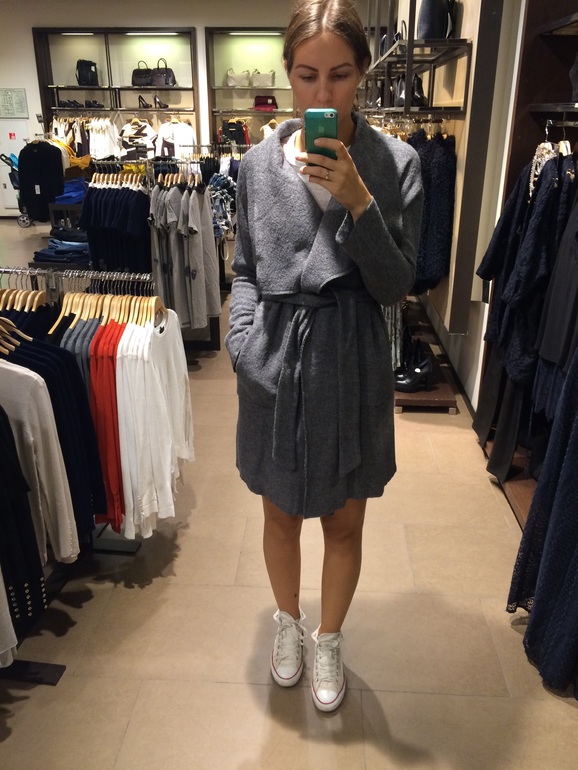 У меня почти такое пальто-халат только рукав тричетверти брала в снежной королеве. Ношу с кроссовками и ботельенами