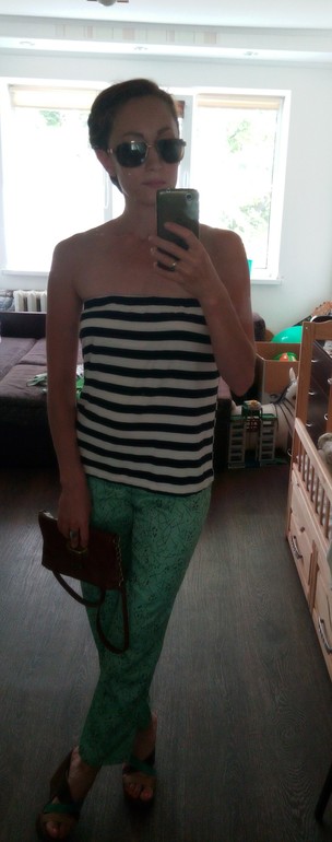 А это мне подогнали отрез натурального шелка советских времён. Очень красивая ткань. Получились вот такие брючки.