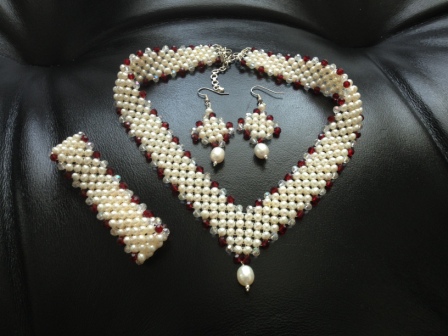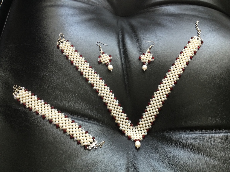 Так, не отвлекаюсь, и обнаружила я у себя любопытный комплект украшений из жемчуга и гранатов, когда-то мне его в качестве сувенира из Индии привезли. Понятно что я его никогда не одевала, но тут любопытство взяло, а с чем его вообще одеть можно? Воображение отказывает напрочь.
