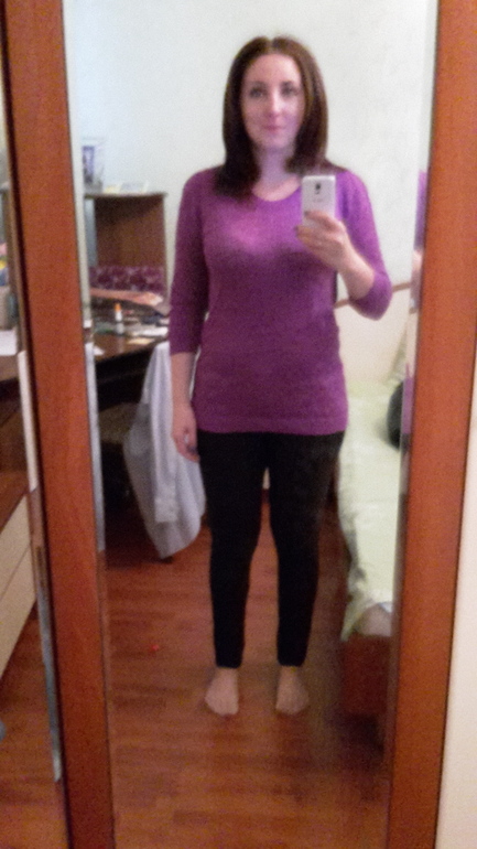 Очень понравился цвет джемпера, мне кажется, Вам к лицу. По фото создается впечатление, что у Вас верх доминирует над низом. Если это так, то Вам лучше покупать джемперы с V-образным вырезом, длиной немного короче, до того места, где начинается самая широкая часть бедра - это уравновесит верх и низ. Я бы попробовала надеть под этот джемпер белую рубашку (если у нее длинные рукава, то тогда закатать их, чтобы получился манжет на рукаве джемпера) - это даст многослойность, "порежет" (а значит, уменьшит) ширину плеч, а закатанные рукава добавят немного небрежности.