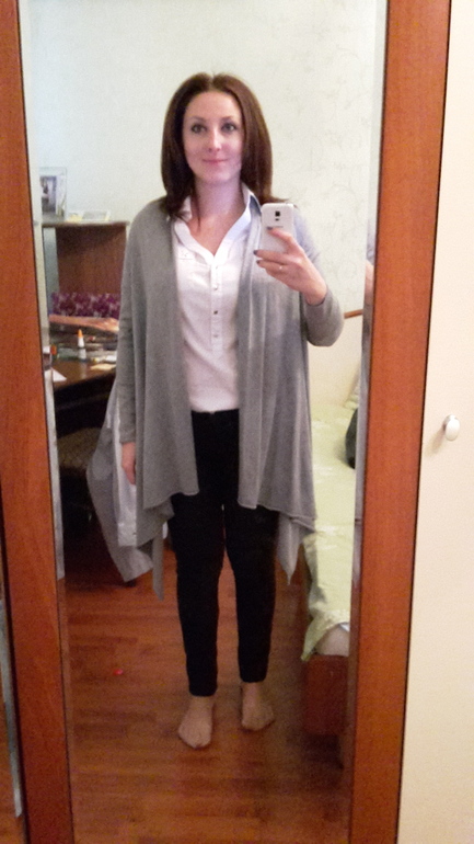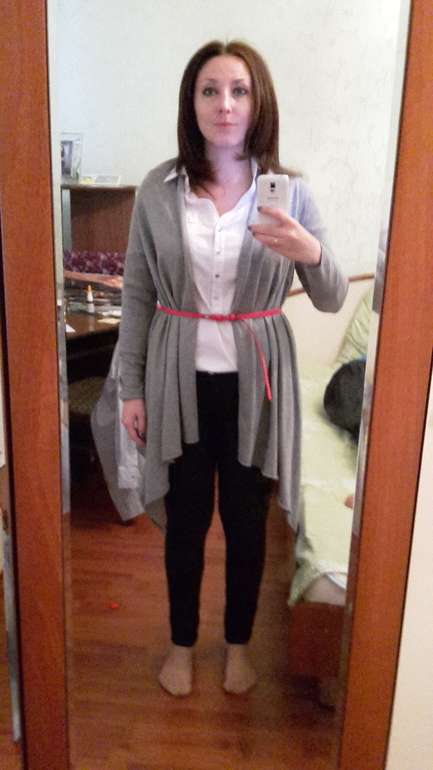 Мне кажется, вариант с белой рубашкой приемлем, только хочется рубашку надеть навыпуск. Тоненький ремешок нравится, но на фото я его вижу розовым, что смущает, я бы перемерила еще с ремнями других цветов и складочки под ремешком немножко распределила по всему кардигану, включая спину. Мне кажется, уместно было бы украшение под рубашку.