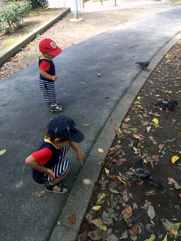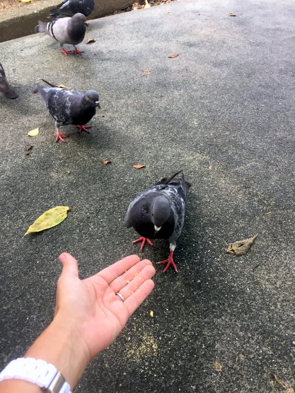 На прогулкеу голубей сегодня был пир! мы решили не выбрасывать остатки булочек, которые не доели дети, взять с собой в парк и покормить голубей. Они клевали прямо с рук