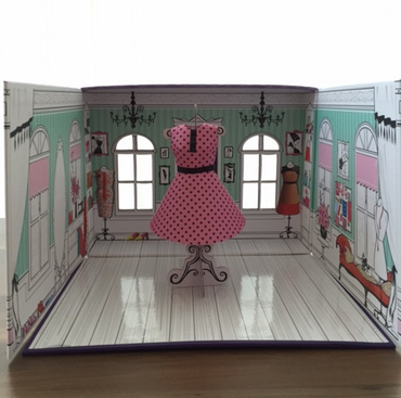 Набор сделан в виде чемоданчика из плотного картона. Открываясь, трансформируется в небольшую студию. В набор по изготовлению одежды из бумаги входит книга с пошаговой инструкцией и разными идеями, цветная бумага, выкройки, манекены из картона.