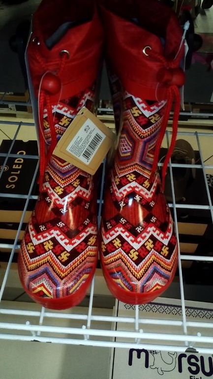 люди-дураки,если видят только "свастику" на сапожках.в любом северном народе эти элементы узора на каждом шагу.у нас вся югра усеяна "оленьими рогами".вроде уже только ленивый не знает,что это знак солнца(свастика). на всех эмблемах
