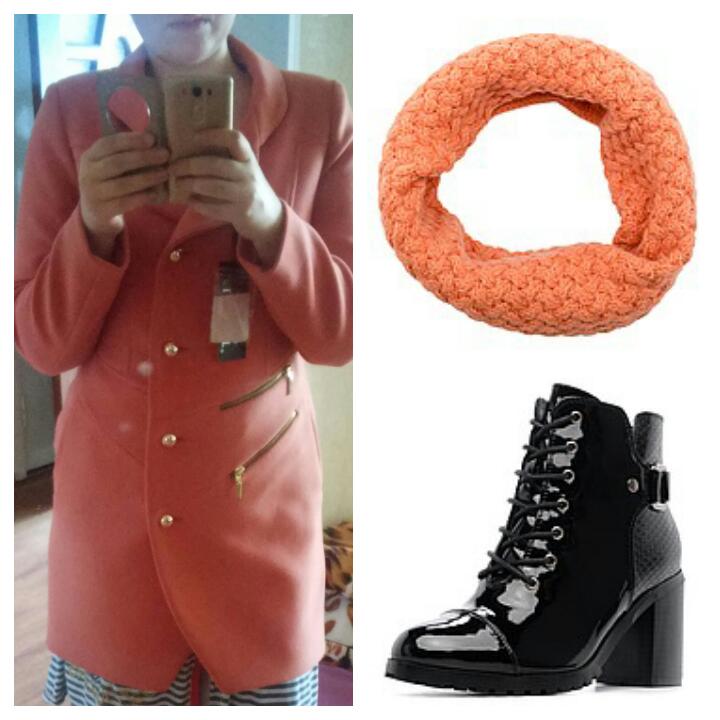 Я бы взяла к пальто сапоги, и не черные, а скорее темно-коричневые. А снуд если не попадает тон-в-тон, то не стоит брать. Да и вообще голубой или синий снуд сюда бы гораздо лучше подошел. Надо только по насыщенности цвета подобрать к пальто - не электрик и не темный, но и не совсем пастельный, если пальто не совсем светлое.