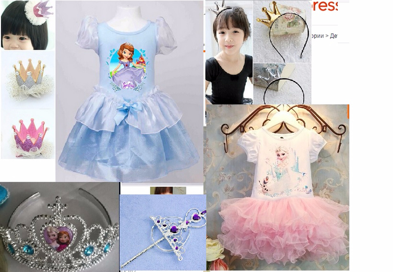3. Ну и праздничная классика - костюм принцессы. Таких платьев на алиэкспресс выбор большой, как и корон, и ободков, и заколок с короной. Одна проблема нет волшебных палочек. Попробуйте написать в поисковике "волшебная палочка" и такая порнуха начнется (в прямом смысле этого слова).