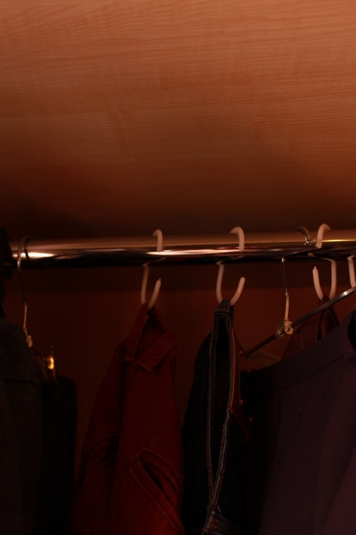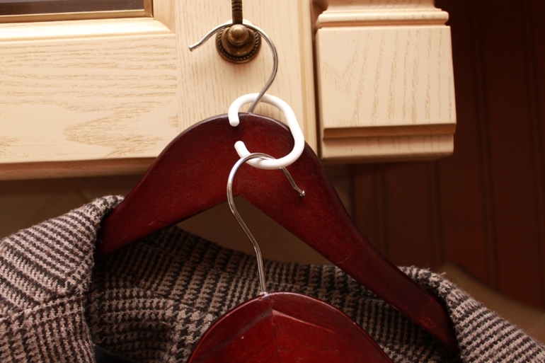 Второй способ - обычные кольца от шторки для ванной. Можно повесить джинсы (об этом много, где написано). А можно повесить вешалку на вешалку: места больше в два раза, вниз не на много удлиняется (5-7см) висящая одежда(подходит для низкого шкафа). И объёмные вещи отлично помещаются. Так я храню жакеты и тяжёлые платья.