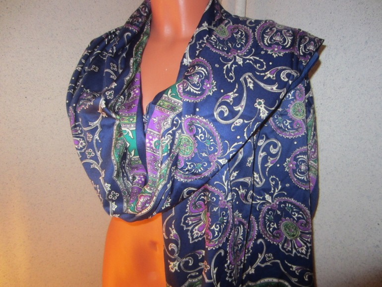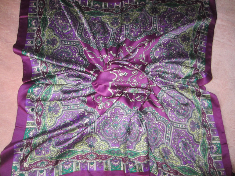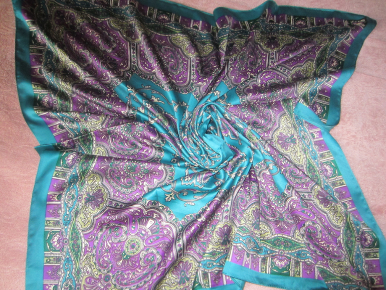 Платок лучше с узором, цвета синий, голубой, сиреневый, фиолетовый, можно синий-белый-красный, или с оранжевым что-то, надо подбирать :)