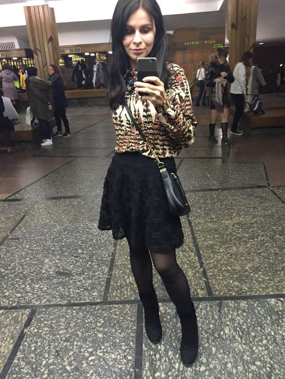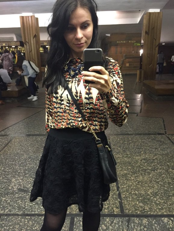 Украшение здесь лишнее, потому что блузка очень пестрая. Бежевые сапоги должны пойти сюда (естественно, с телесными колготками), но и на фасон нужно посмотреть. В целом очень милый образ, мне понравился, но я бы еще голове внимание уделила. Можно сделать крупные локоны-волны.