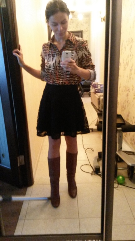 Лично меня такой вариант тоже устраивает и ничего ужасного я не увидела. Как я и предполагала, сапоги не такие уж и бежевые. Но длина черных сапог удачнее, на мой взгляд. Лучше, если сапоги будут чуть длиннее или юбка