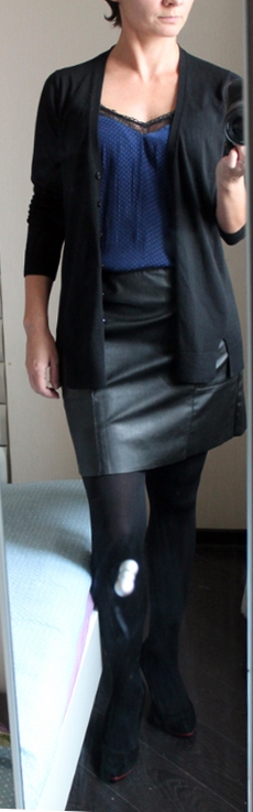 Первый нет - слишком много намешано и кожа и шифон и плотные колготки с туфлями в тон и удешевляющий все это трикотаж. Второй - ок)