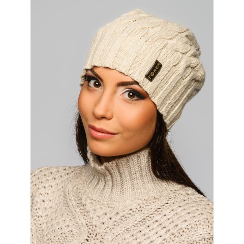 Если парка с капюшоном и не рассчитана на сильные морозы, то может и не надо искать шапку? Бежевый свитер крупной деревенской вязки с высоким воротом защитит Вас в холодную осеннюю погоду и освежит образ.