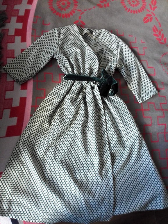 Меня пояс очень смущает...бархатный. А платье очень даже неплохое. Горошек в тренде, хоть мелкий отходит уже. Но, сезон еще продержится. Я бы пояс заменила на ремень. Черного цвета, кожаный. Черные плотные колоты, лабутены черные с скрытой платформой, или брутальные черные сапоги... Эдакое смешение стилей романтизм и милитари...