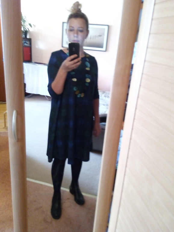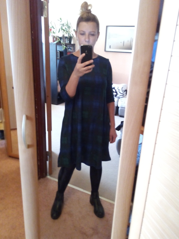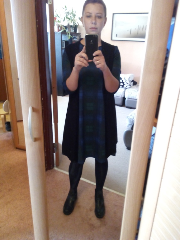 У меня такой модели чёрное платье, ношу с плотными колготками, сапожками на/без каблука, с шарфами разными, с удлинённым жилетом...