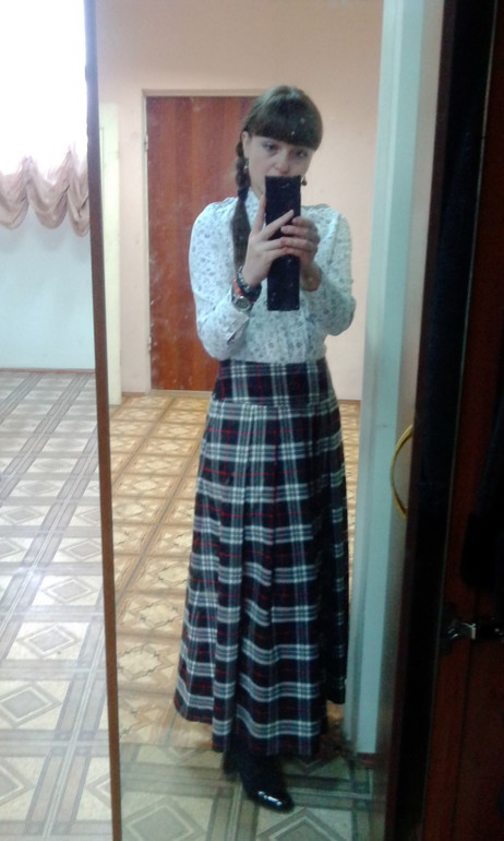 я носила такую юбку с водолазками однотонными. у меня была бежевая клетка