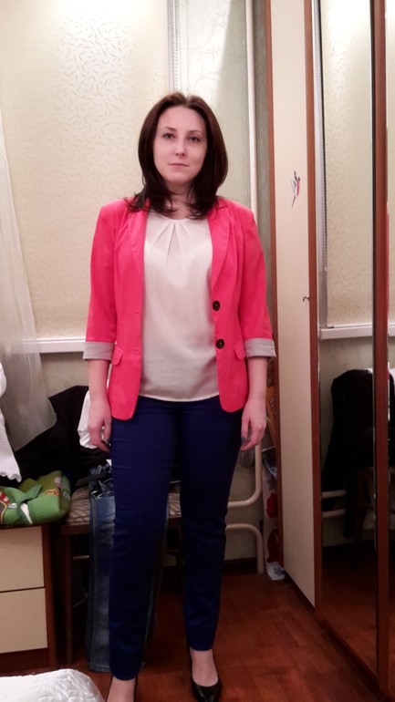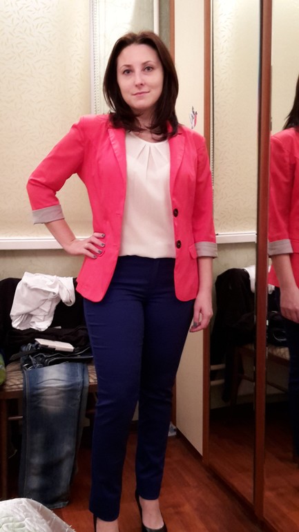 Дн) очень симпотично получилось с красной блузкой, заправленной в штанишки!! Ещё ремень в штаны вставить и вообще классно будет) и с ярким пиджаком тоже хорошо!! Вам действительно очень к лицу что-то яркое!)