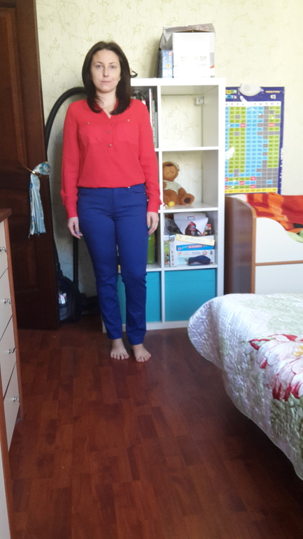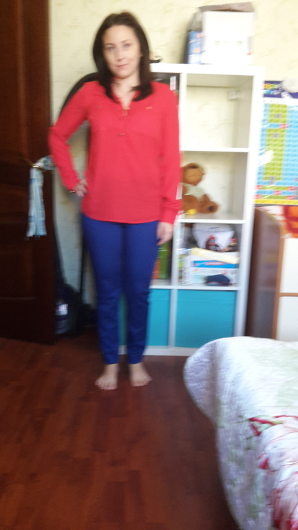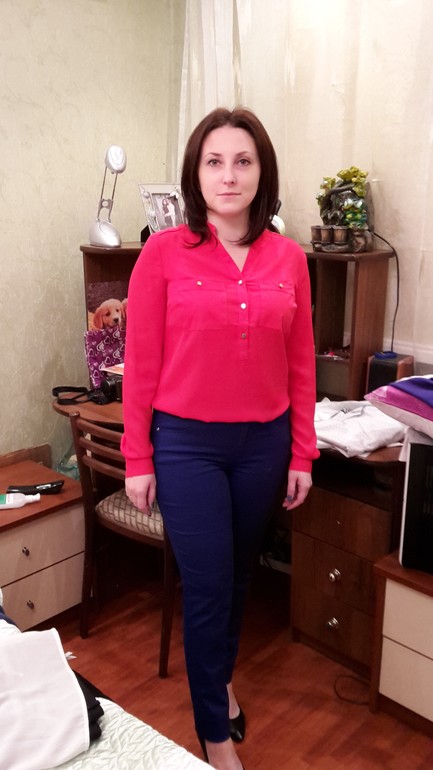 цвет настоящий штанов который ниже. даже с таким ярким цветом хорошо блузка?