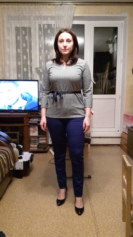 Единственный отличный вариант это с красной блузкой заправленной в брюки. Остальное всё сидит хорошо, но скучно очень. А вот тот вариант очень Вам идёт!