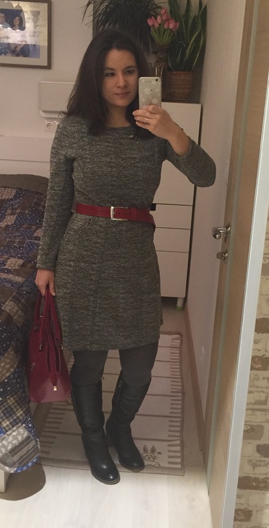 Поясом Вы разрезали себя на три части. Поэтому, колготки только черного цвета, есди носите это платье с черными сапогами такой длины. Я бы посоветовала Вам купить яркий удлинненный, слегка приталенный, жилет, на две, а то и на три, ладони длиннее платья. Жилет в дальнейшем сможете использовать в базовой капсуле, как с платьями, так и с брюками/джинсами.... Я бы поискала что-то в стиле пэчворк, в теплых осенних оттенках.