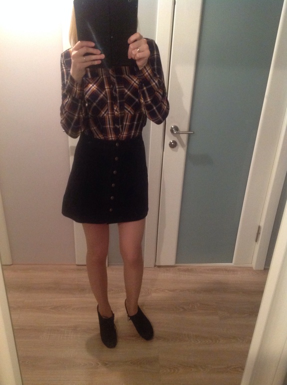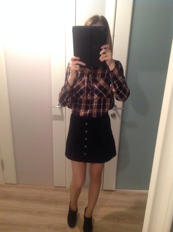1) рубашка в клетку+замшевая юбка. Подходит ли рубашка, она достаточно объемная/свободная и это меня смущает) какую обувь можно сюды? и длина юбки не слишком?