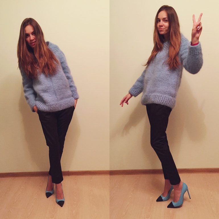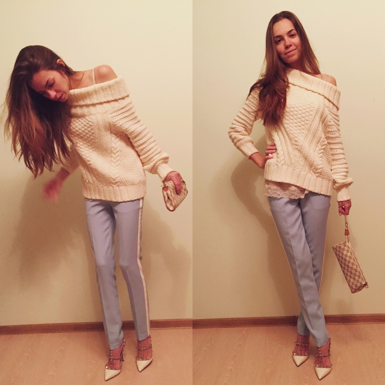 Вот верхний белый он акрил и совсем не теплый, поэтому его можно весной, ранней осенью, и знаете, когда весной начинается погода то холодно, то жарко, я бы добавила на свитер пальто нараспашку. с 3 образом сложнее, тк эта ручная работа и полностью натуральный состав 80% шерсти, в 2 нитки.. Он такой теплый, что можно заменить им кожаную куртку или тонкое пальто🙈 Естественно все образы на каблуках, поэтому не предполагают активити с детьми. Скорее так: погода +8-12 гр, муж позвал в кино/кафе/в гости на праздник. Прошли до машины, в помещении сняли) свитер как верхняя одежда получается в данном случае.