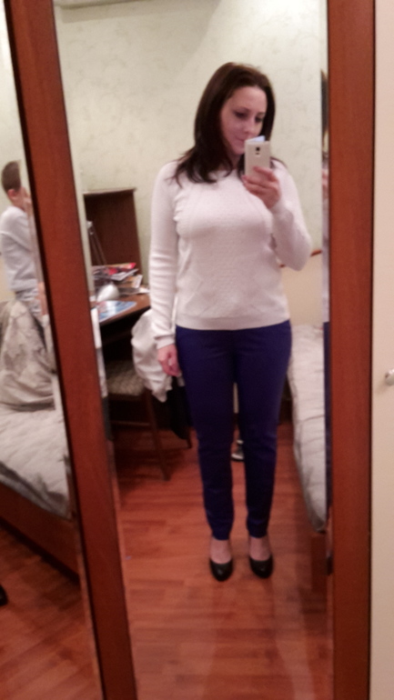 С Вашим типом фигуры надо талию подчеркивать. Поэтому Вы , наверно, сами на фото видете, что образ с жакетом выглядит лучше. А вот свободные свитерочки и кофточки делают верх фигуры квадратной! Подойдёт блузка, заправленная, и красивый пояс на брюки, который подчеркнёт талию. Белый свитер тоже придаёт объём. И пуховик, конечно, тоже. Не ваш фасон, извините.