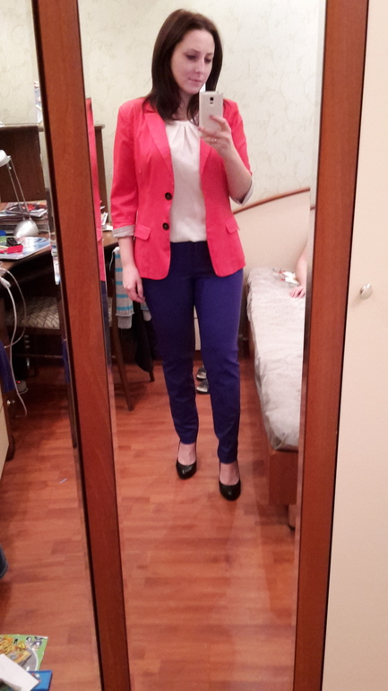 Вариант с пиджаком замечателен (цвет пиджака только не совсем к брюкам подходит, имхо). Он соблюдает нужные пропорции. Длинные кофты Вас зрительно делают ниже, а ноги короче. Заправленная блуза гораздо больше идет. А пиджак сверху приталенный делает акцент на талию, добавляет вертикальных линий и очень удачен по длине. В общем, украшает Вас такая форма.