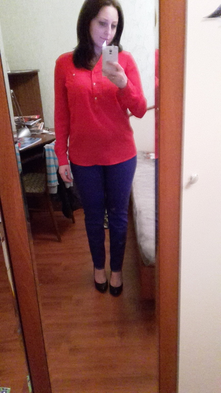 С первой кофтой не очень, она длинная слишком, и с синей сливается. Блузку заправленную лучше. А пуховик норм, но я за другой голосовала :) мне на вас этот цвет не нравится.